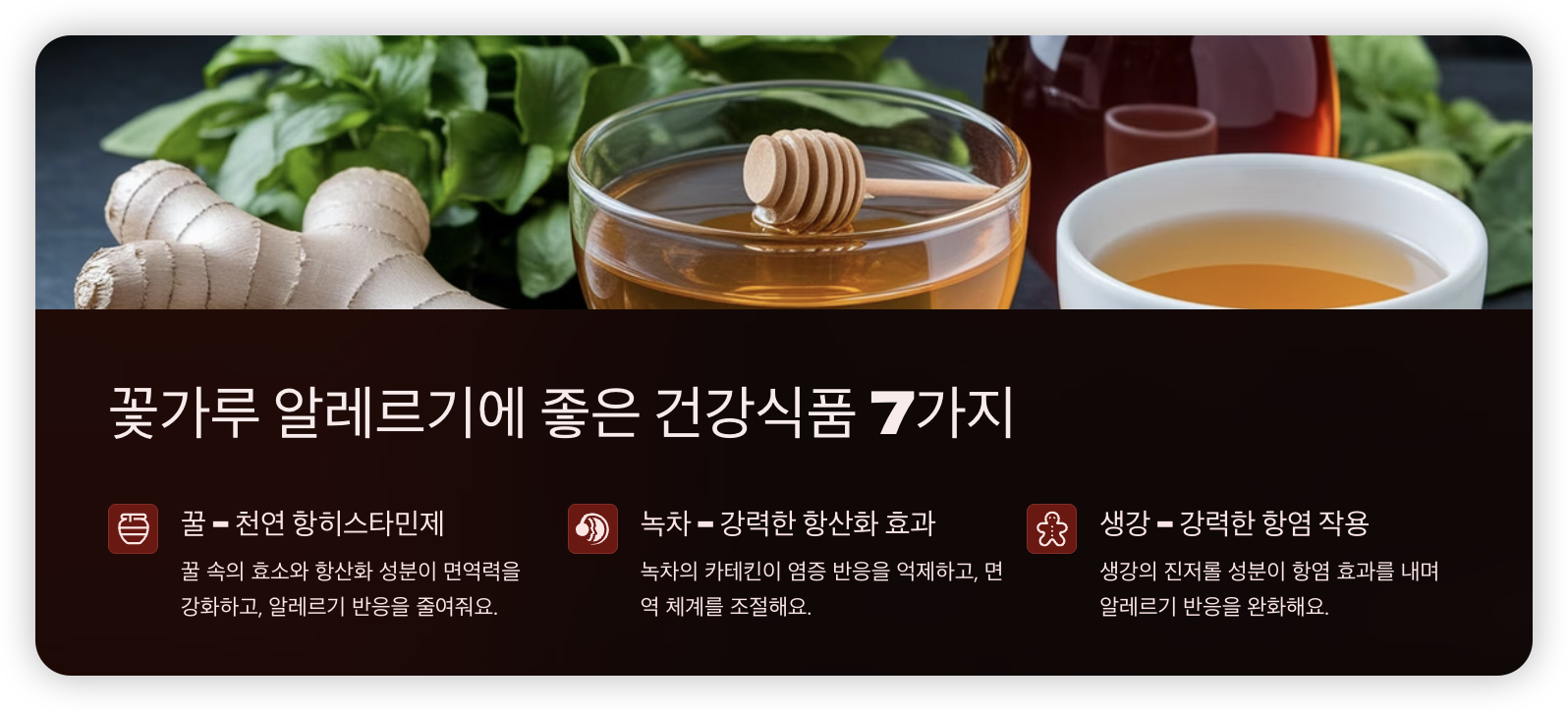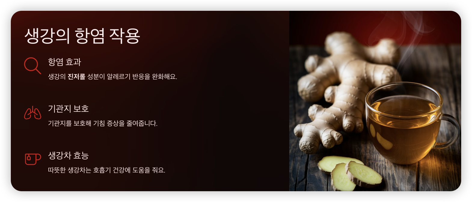 ✅ 생강의 진저롤(Gingerol) 성분이 항염 효과를 내며 알레르기 반응을 완화해요.