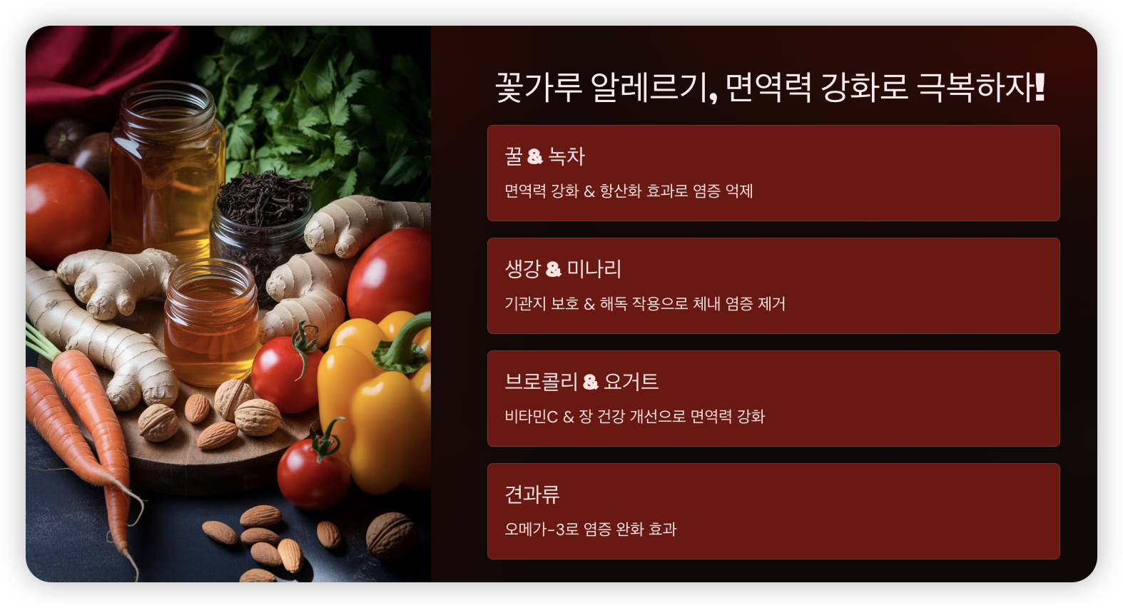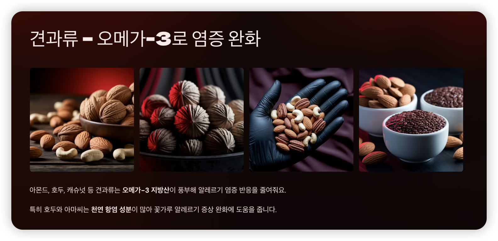 ✅ 특히 호두와 아마씨는 천연 항염 성분이 많아 꽃가루 알레르기 증상 완화에 도움을 줍니다.