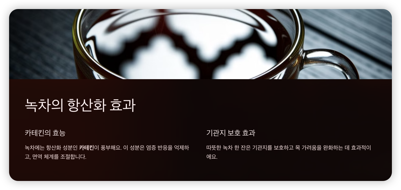 ✅ 녹차에는 항산화 성분인 카테킨(Catechin) 이 풍부해 염증 반응을 억제하고, 면역 체계를 조절해요.