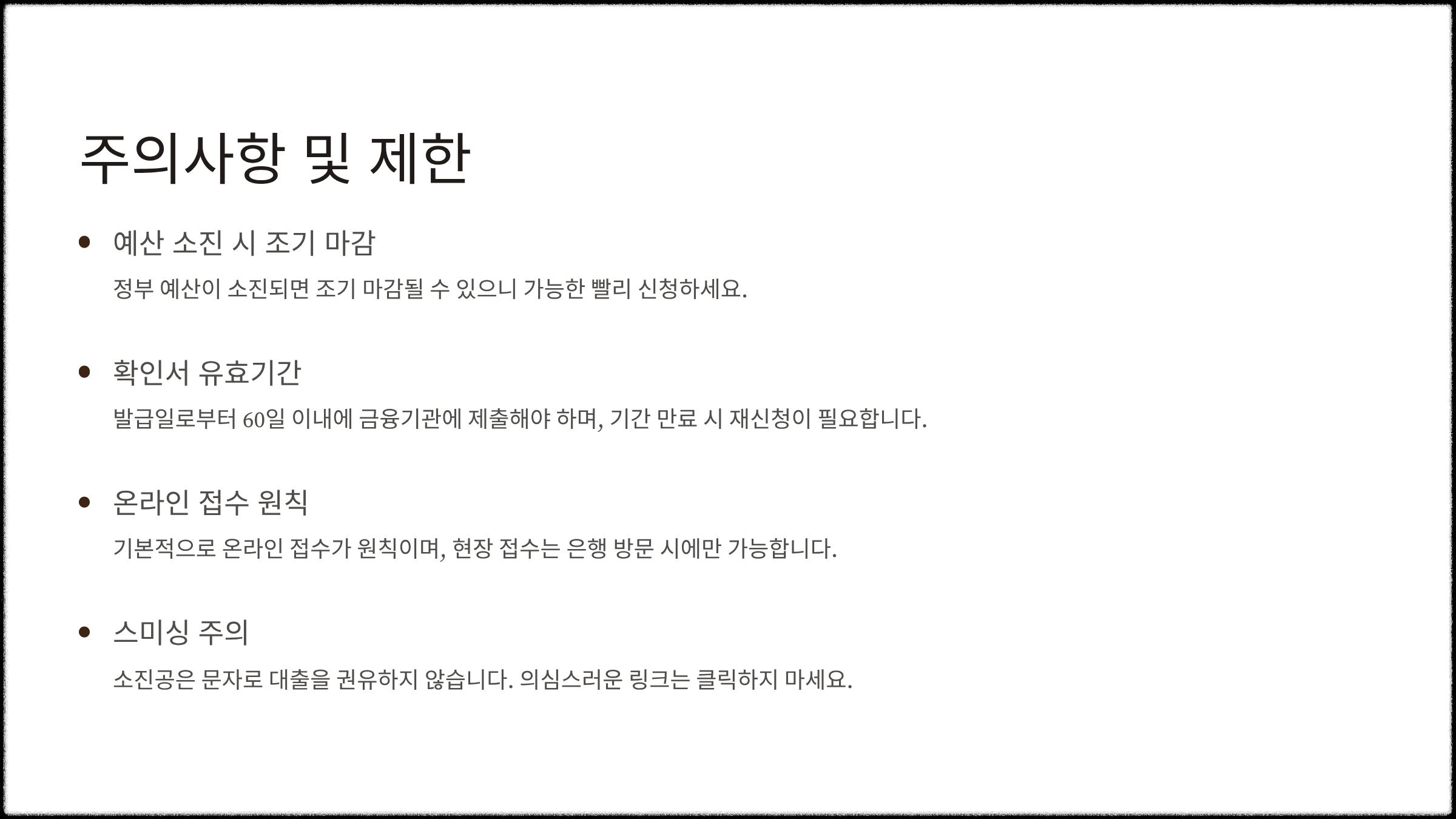 - 온라인 접수가 기본이며, 현장 접수는 은행 방문 시에만 가능(서류 완비 필수).