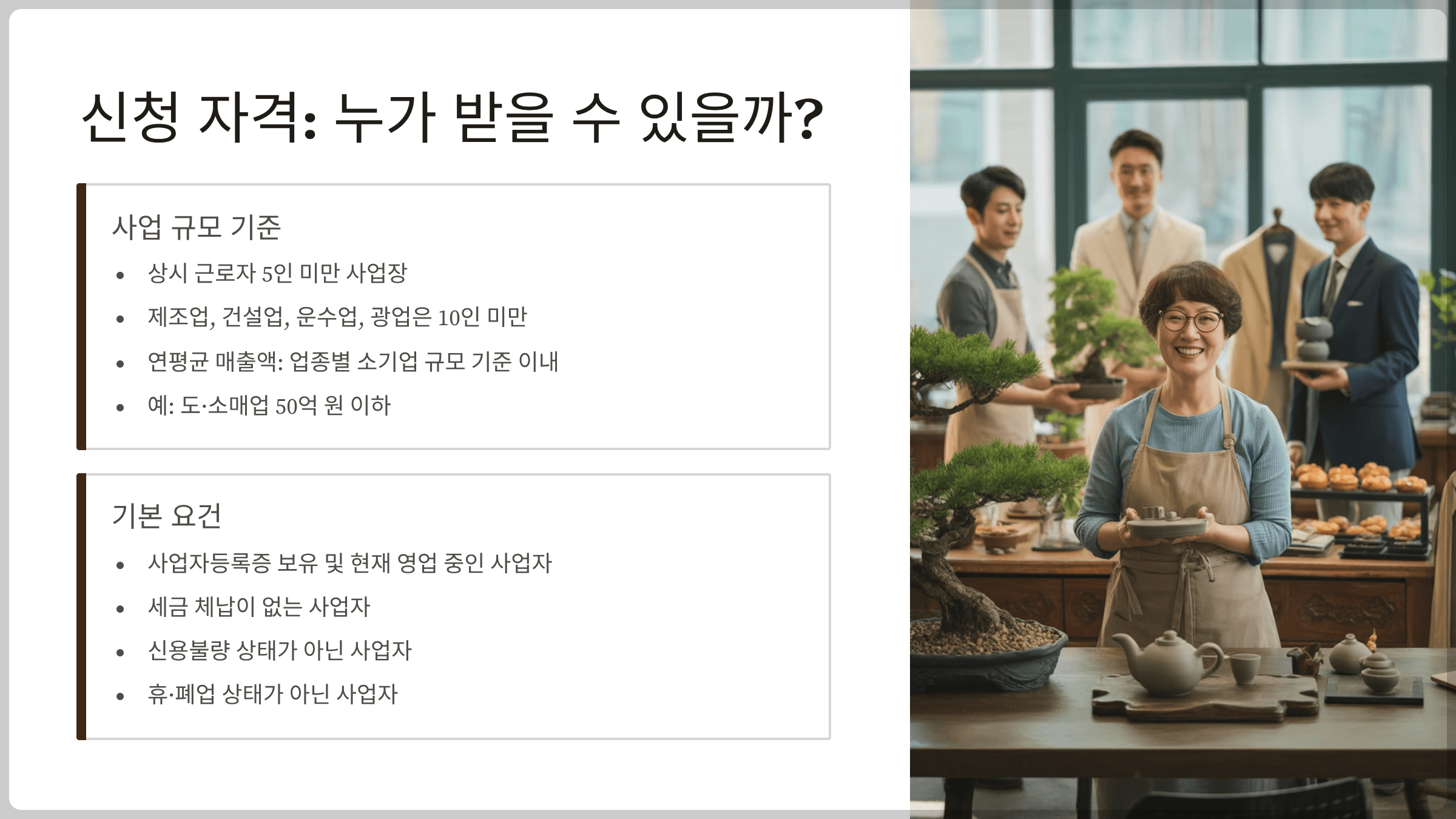 - 연평균 매출액: 업종별 소기업 규모 기준 이내(예: 도·소매업 50억 원 이하).